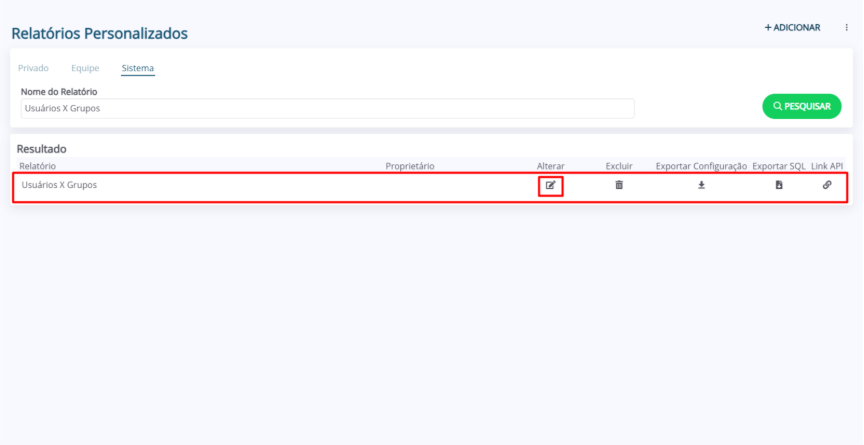 2. Na listagem “Resultado”, localize o relatório e clique no ícone da coluna “Alterar”.