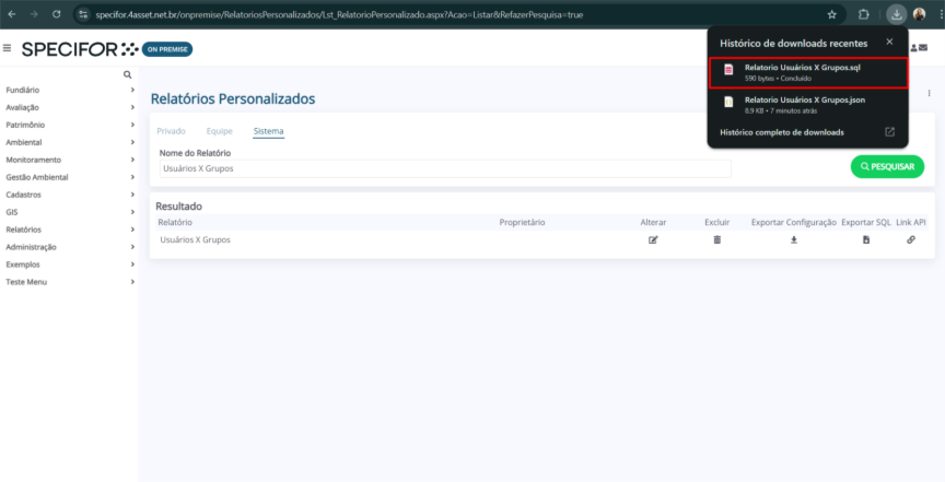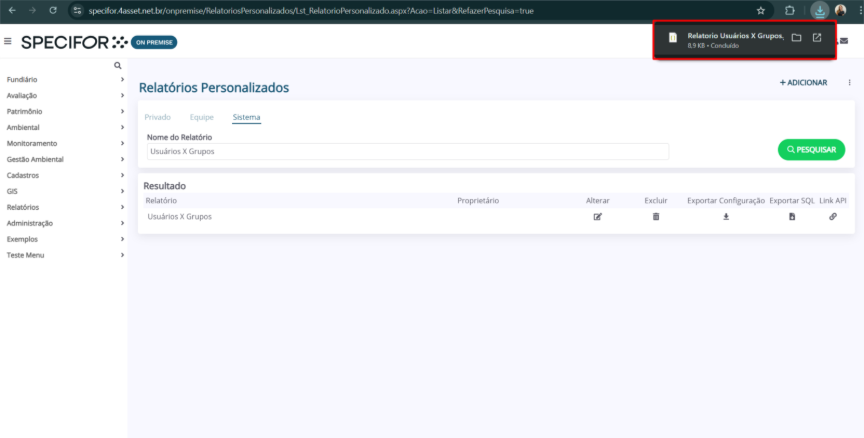8. O relatório será disponibilizado no menu relacionado ao tipo de disponibilização selecionado na etapa anterior.