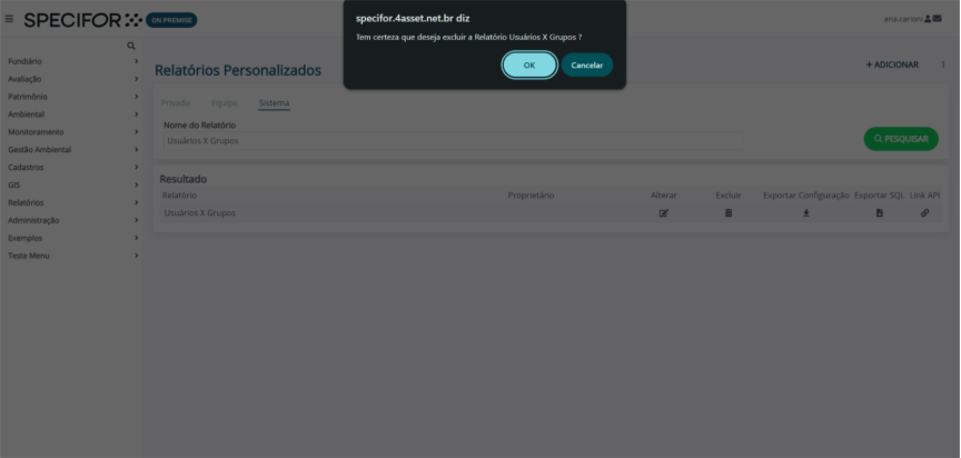 1. Na página “Relatórios Personalizados”, selecione o menu do relatório (Privado, Equipe, Sistema). Em seguida, utilizando o campo de filtragem “Nome do Relatório”, preencha o nome do relatório que deseja excluir e clique em “Pesquisar”.
