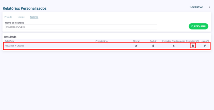 2. Na listagem “Resultado”, localize o relatório que deseja Exportar e clique no ícone da coluna “Exportar SQL”.