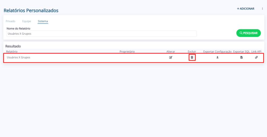 2. Na listagem “Resultado”, localize o relatório e clique no ícone da coluna “Excluir”.