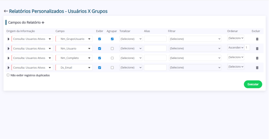 - Exibir: Indica se o campo selecionado será exibido como coluna no resultado do relatório.