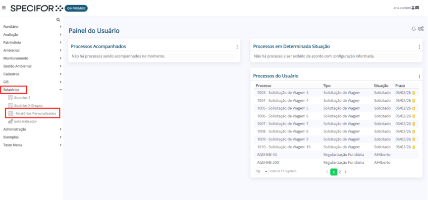 1. Na página inicial do Specifor, no menu lateral à esquerda, clique em "Relatórios" e, em seguida, "Relatórios Personalizados".