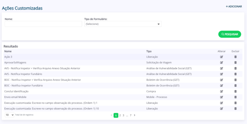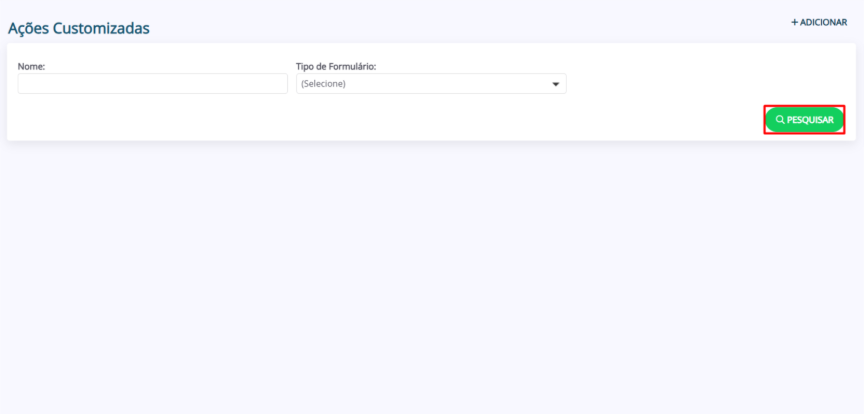 Para visualizar a listagem com as ações customizadas do sistema, clique no botão "Pesquisar", sem preencher os campos de filtragem.