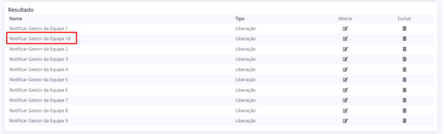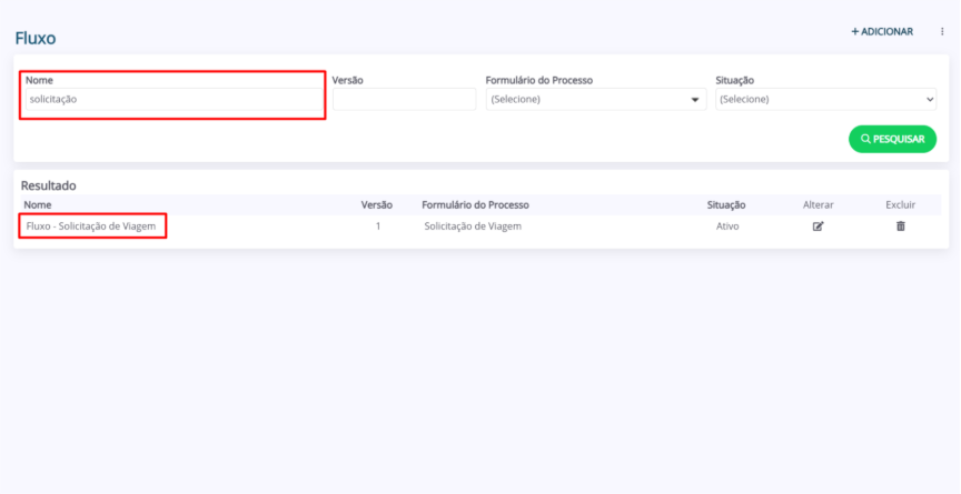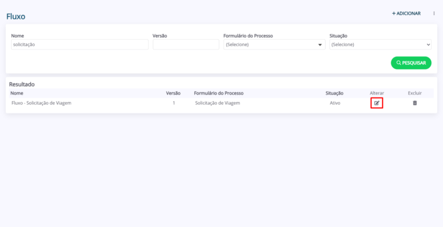 3. Na listagem “Resultado”, localize o fluxo e clique no ícone da coluna "Alterar”.