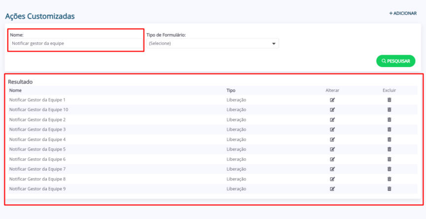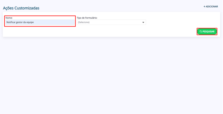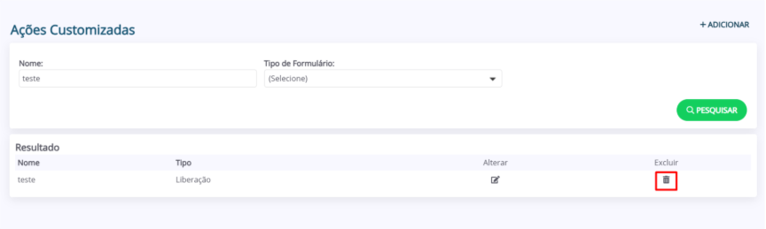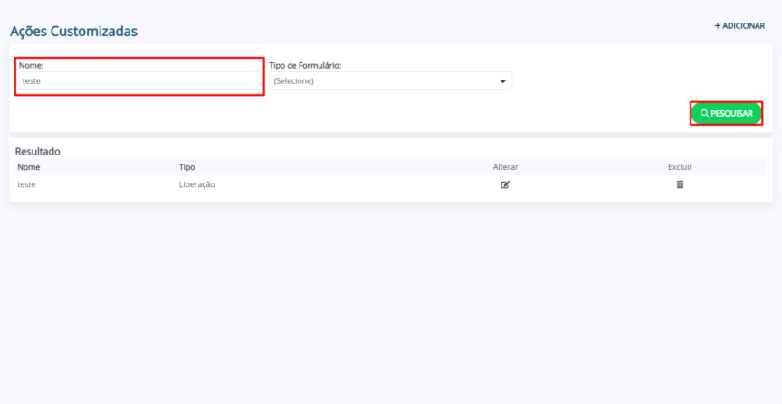 1. Na página “Ações Customizadas”, utilizando o campo de filtragem “Nome”, preencha-o com o nome da ação que deseja excluir. Em seguida, clique em “Pesquisar”.