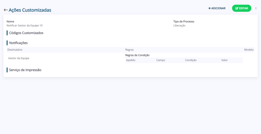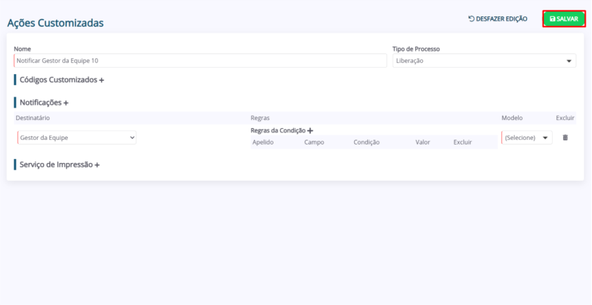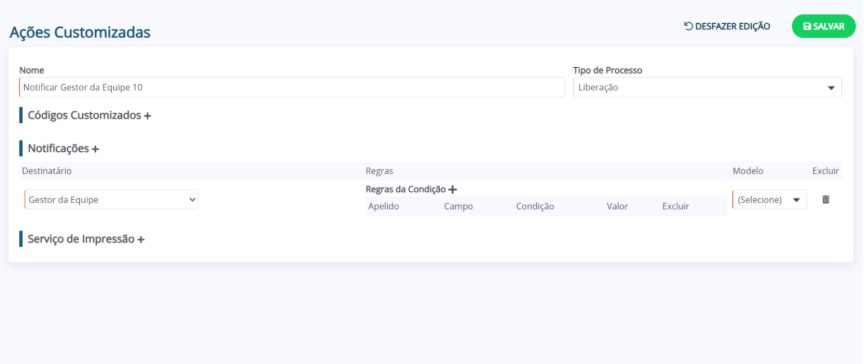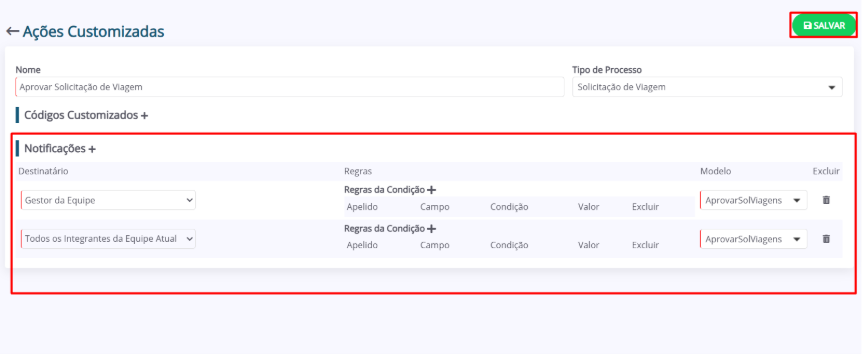 - Notificações: definir quem será o destinatário da notificação; regras da condição (se existirem)