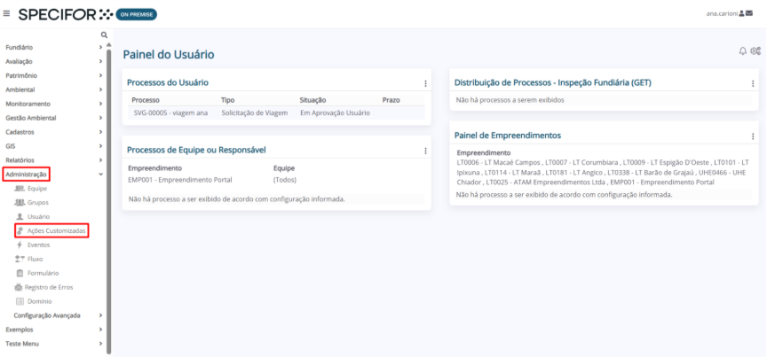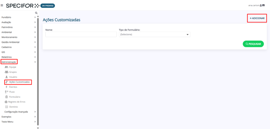 1. Na página inicial do Specifor, no menu lateral à esquerda, clique em "Administração" e, em seguida, "Ações Customizadas".