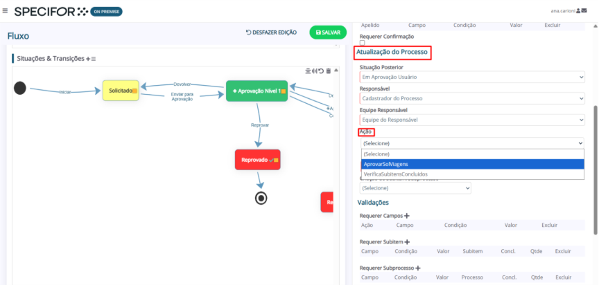 Após cadastrada, a ação fica disponível para associação com o Fluxo. Ao montar o Fluxo, é necessário informar em qual estado a ação será executada.
