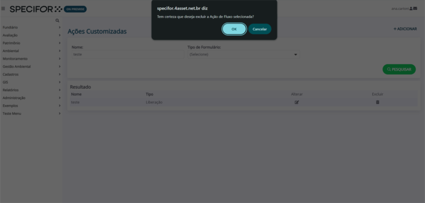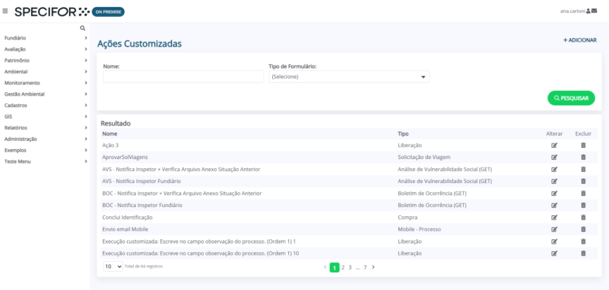 Esta seção descreve como acessar e gerenciar ações customizadas no Specifor, permitindo que você visualize, crie, edite e exclua ações customizadas do sistema.