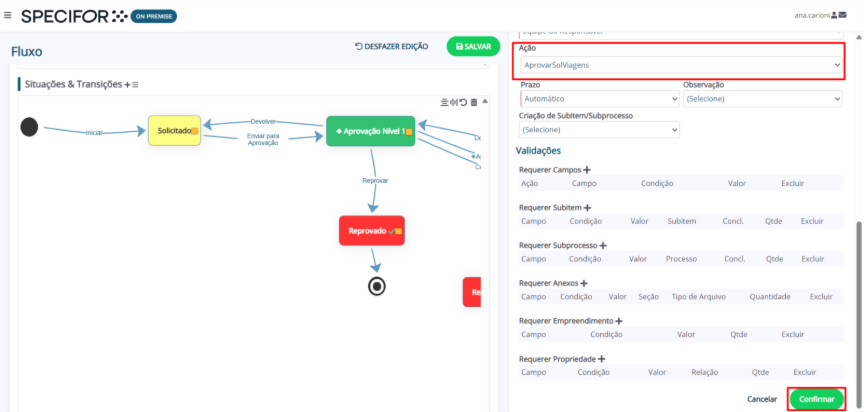 4. Role a página do fluxo até a seção “Situações & Transições”. Em seguida, dê um duplo clique na transição que deseja utilizar como gatilho para a ação customizada.
