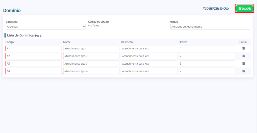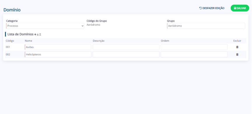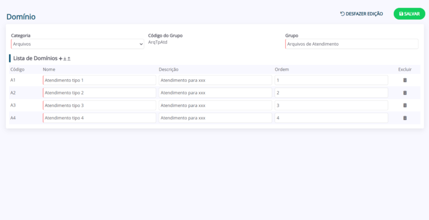 - Lista de Domínios (Código, Nome, Descrição, Ordem, Valor)