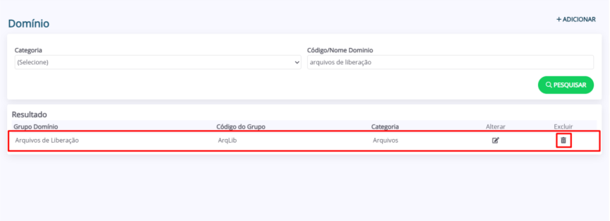 2. Na listagem “Resultado”, localize o domínio e clique no ícone da coluna "Excluir”.