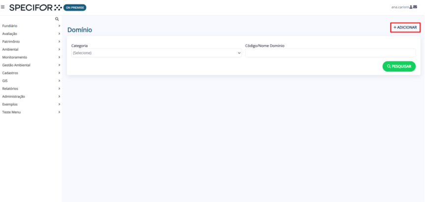 1. Na página inicial do Specifor, no menu lateral esquerdo, clique em "Administração" e, em seguida, em "Domínio".