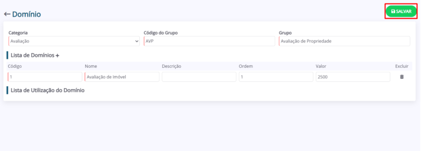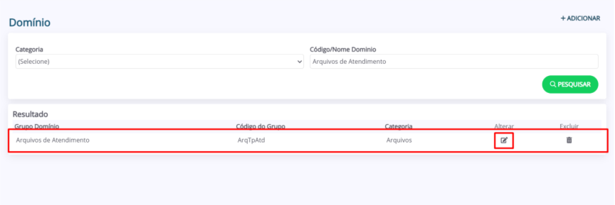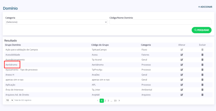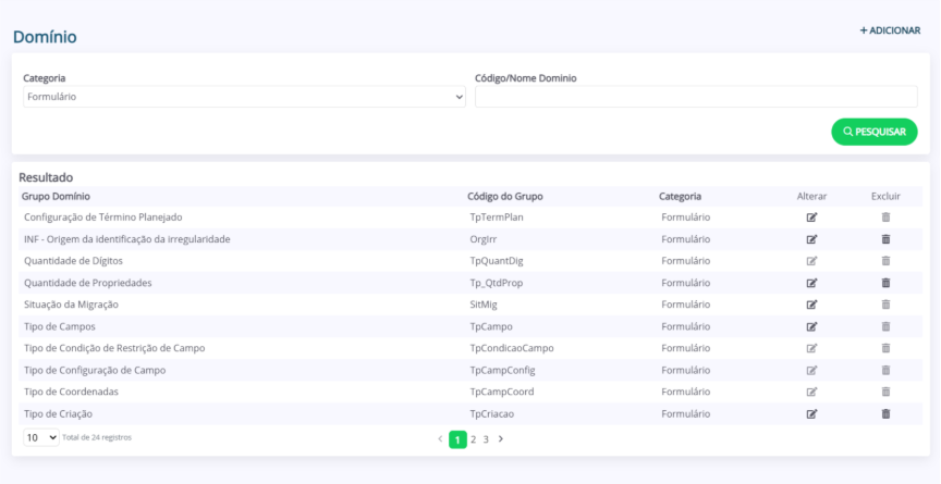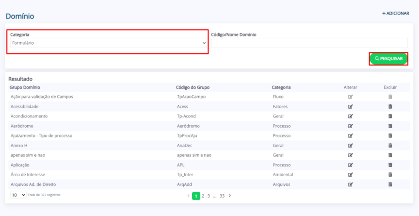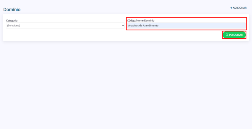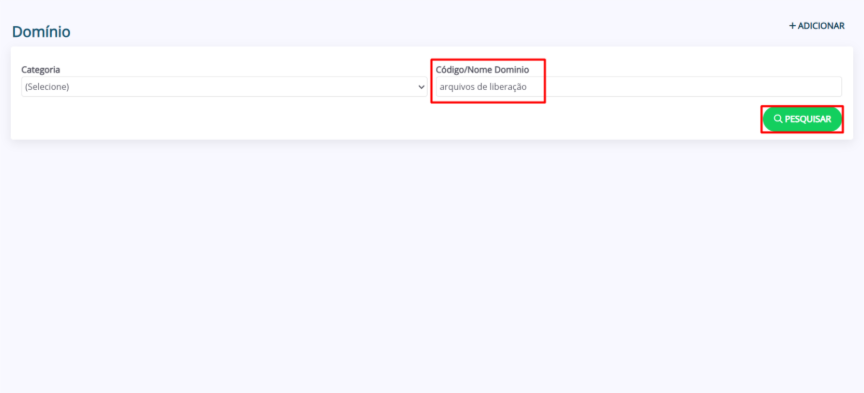 Para visualizar a listagem com os domínios do sistema, clique no botão "Pesquisar", sem preencher os campos de filtragem.