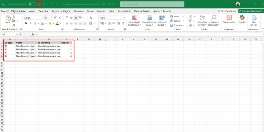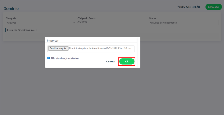 3. Retorne ao Specifor. Na página de edição do domínio, clique no ícone de seta para cima (Importar lista de domínio). Selecione o arquivo Excel editado na etapa anterior e clique em “Ok”.