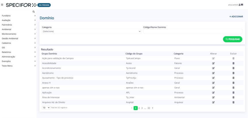 O módulo de Domínios é responsável por organizar e padronizar os valores utilizados nos formulários do Specifor. Por meio dele, é possível definir listas controladas de opções que serão apresentadas aos usuários durante o preenchimento dos formulários.