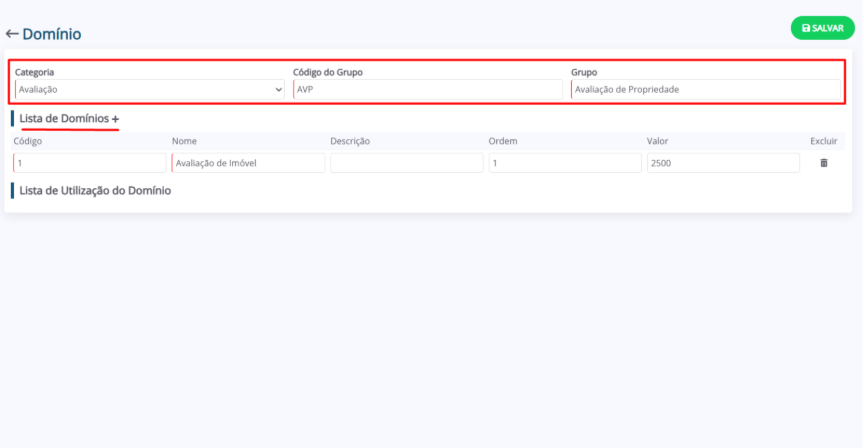 Um domínio representa um conjunto de valores pré-definidos, agrupados por um tema específico e associados a uma determinada categoria do sistema. Esses valores passam a ser reutilizáveis em diferentes formulários, evitando digitação livre, reduzindo erros e assegurando uniformidade nos dados.