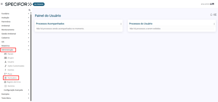 1. Na página inicial do Specifor, no menu lateral à esquerda, clique em "Administração". Em seguida, no submenu, clique em "Formulário".