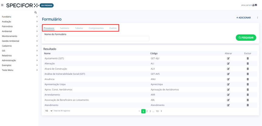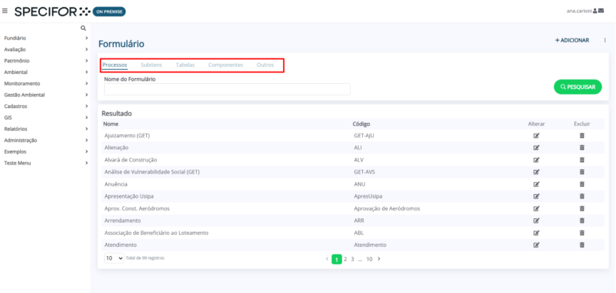 1. Na página de formulários, utilizando as abas de navegação, selecione qual o tipo do formulário que deseja encontrar (Processos, Subitens, Tabelas, Componentes, Outros).