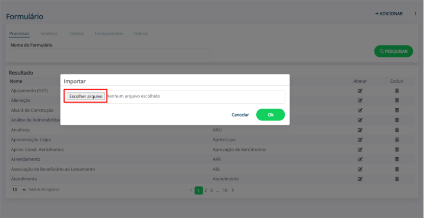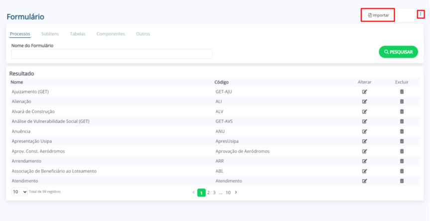 2. Na página de formulários, é possível navegar pelos tipos de formulário (Processos, Subitens, Tabelas, Componentes, Outros). Também, há o campo para busca de formulários específicos, através do nome do formulário.
