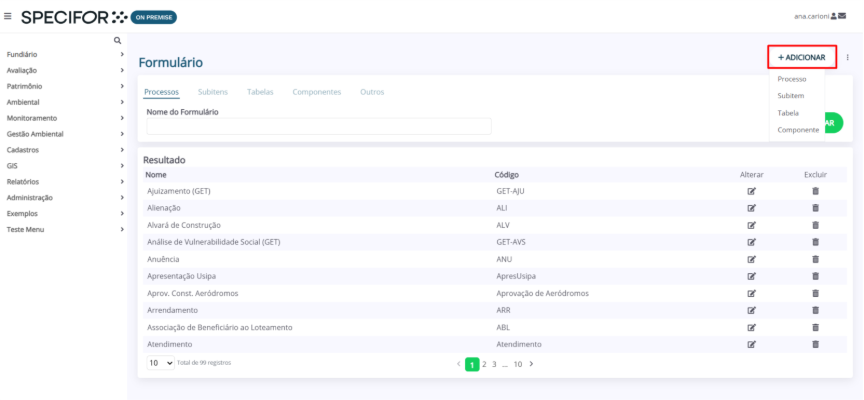 1. Na página “Formulário”, clique no botão "+ Adicionar". Em seguida, selecione no menu suspenso qual o tipo de formulário que deseja criar (Processo, Subitem, Tabela ou Componente).