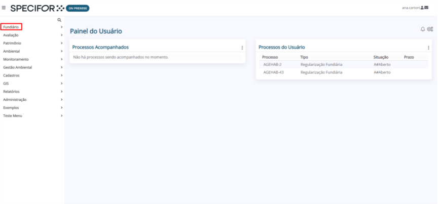 1. Utilizando o menu lateral, selecione o módulo de processos que deseja acessar. Em seguida, clique no menu do processo que deseja editar.