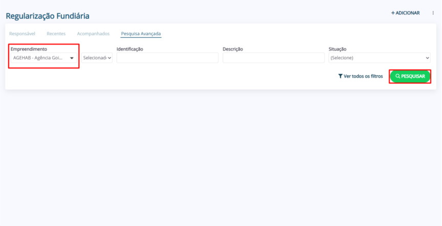 2. Na página do processo, busque pelo processo que deseja editar utilizando a aba "Pesquisa Avançada", preenchendo os campos de filtragem para encontrá-lo.