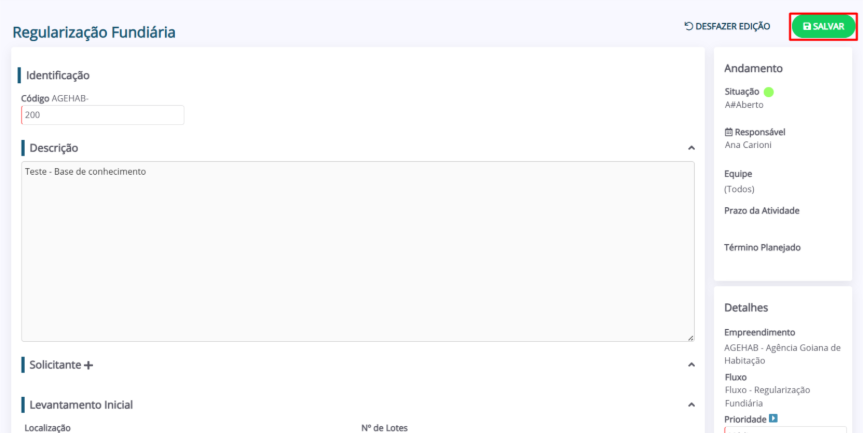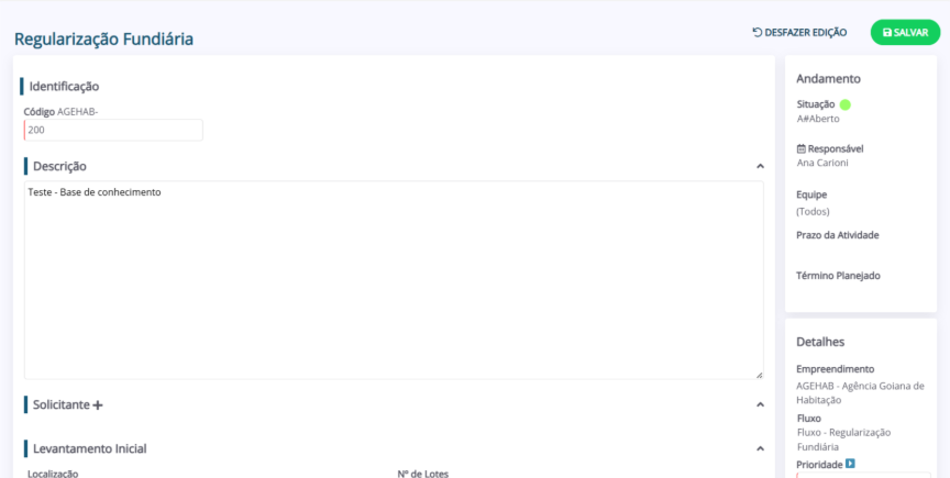 4. A página de edição do processo será aberta. Nela, é possível fazer edições em todas as informações relacionadas a ele, além de acompanhar seu andamento, histórico e detalhes.