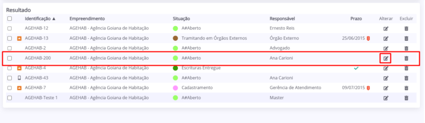 3. Na listagem “Resultado”, localize o processo e clique no ícone da coluna "Alterar”.