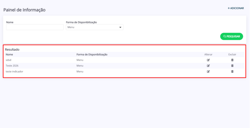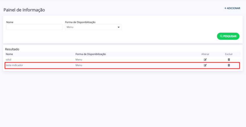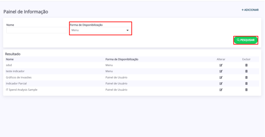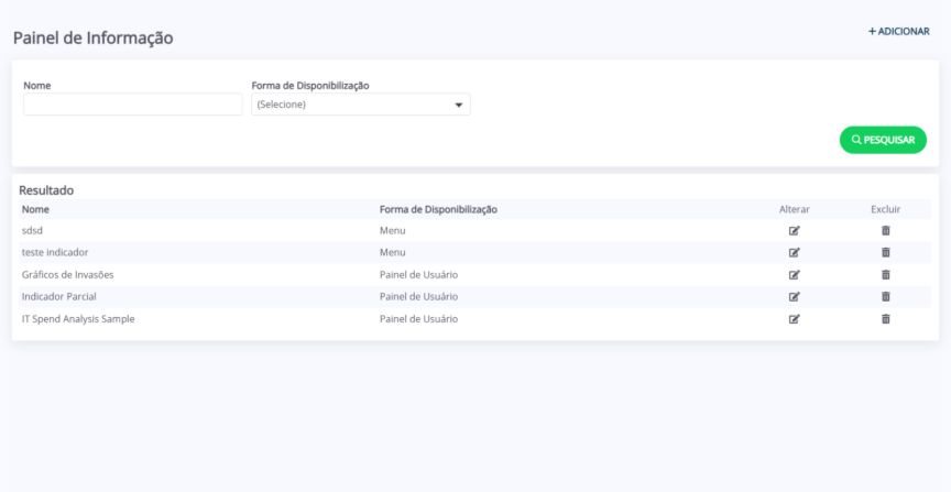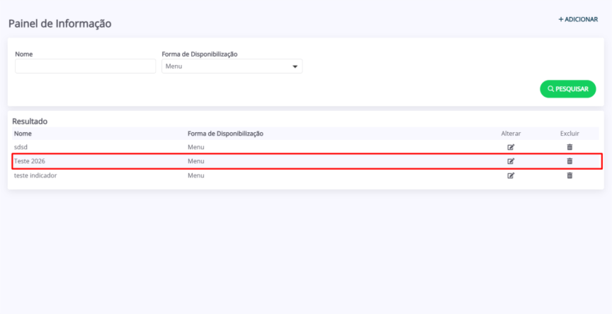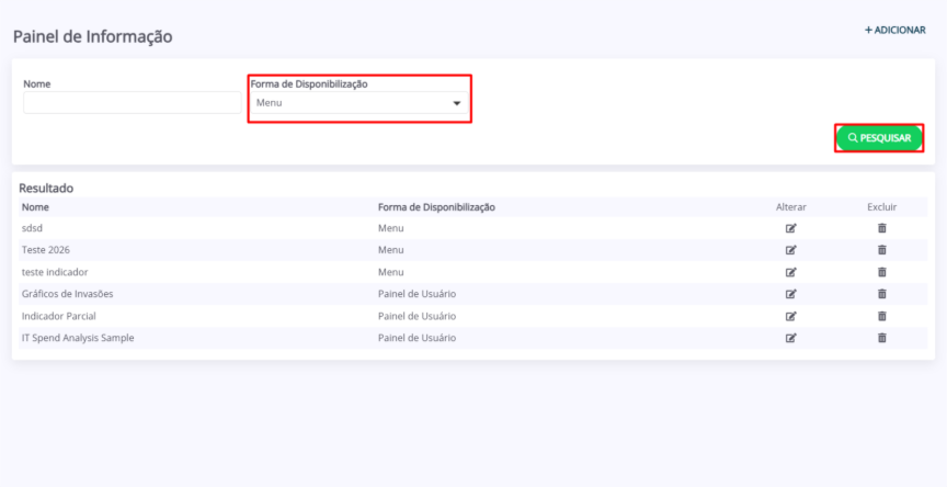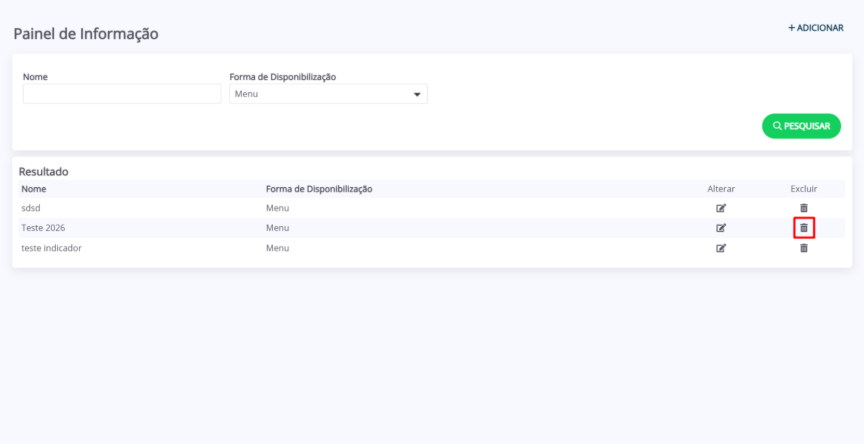 1. Na página “Painel de Informação”, utilizando os campos de filtragem, encontre o Painel que deseja excluir.