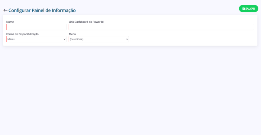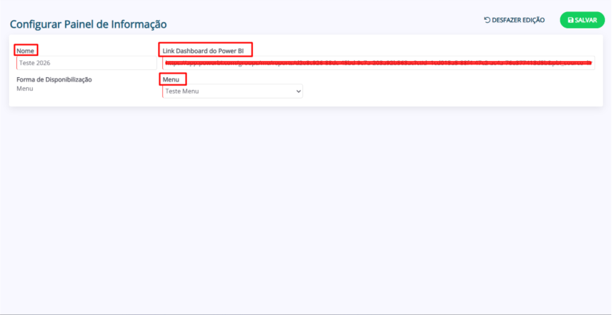 4. A página de edição do Painel de Informação selecionado será aberta. Nela, é possível editar as informações vinculadas ao painel: Nome, Link Dashboard do PowerBI e Menu.