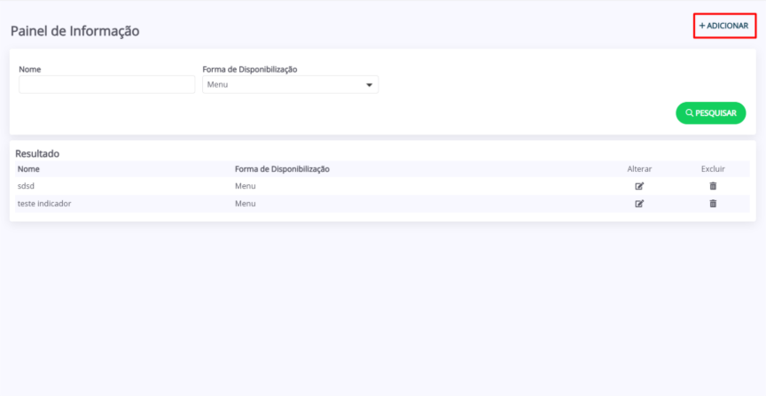 1. Na página "Painel de Informação", clique em "+ Adicionar" no canto superior direito.