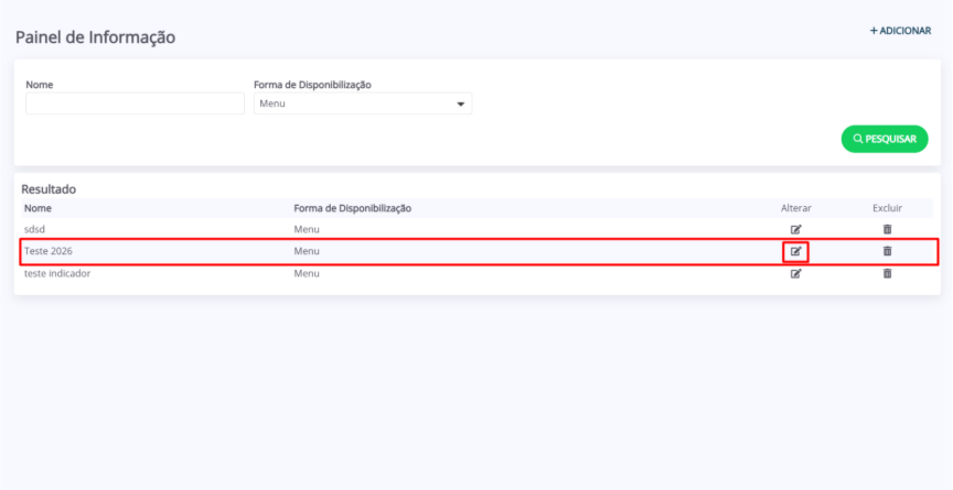 3. Encontre o Painel de Informação que deseja editar e clique no ícone da coluna “Alterar” na mesma linha.