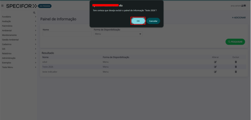 3. Uma caixa surgirá no centro da tela, solicitando que o usuário confirme a exclusão. Para prosseguir, clique em “Ok”.