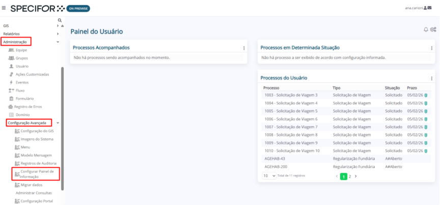 1. Na página inicial do Specifor, utilizando o menu lateral à esquerda, clique no módulo "Administração". Em seguida, clique no submenu "Configuração Avançada" e escolha a opção “Configurar Painel de Informação”.