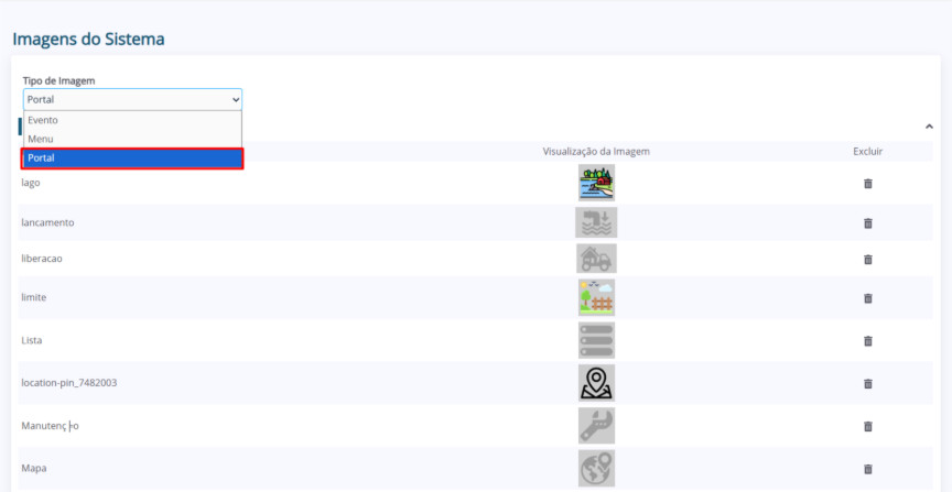3. Utilizando o menu “Tipo de Imagem”, você pode navegar pelas imagens cadastradas em cada categoria: Evento, Menu, Portal