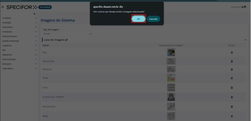 4. Uma caixa surgirá no centro da tela, solicitando que o usuário confirme a exclusão. Para prosseguir, clique em “Ok”.