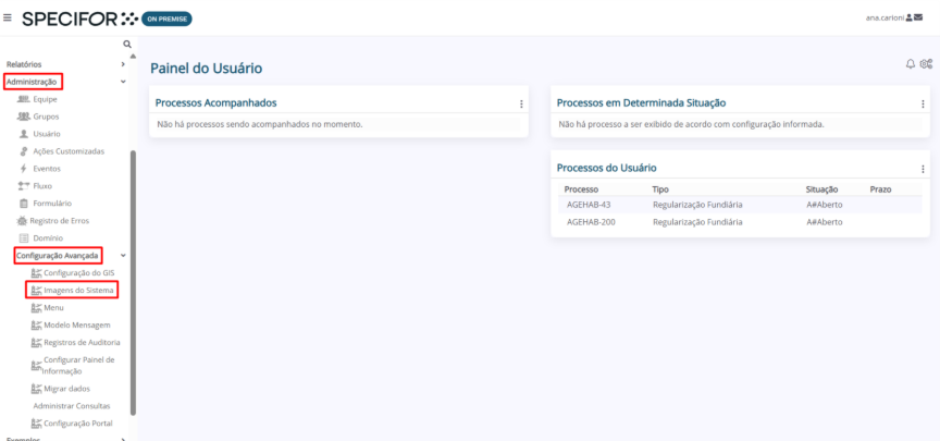 1. Na página inicial do Specifor, utilizando o menu lateral à esquerda, clique no módulo "Administração". Em seguida, clique no submenu "Configuração Avançada" e escolha a opção "Imagens do Sistema".