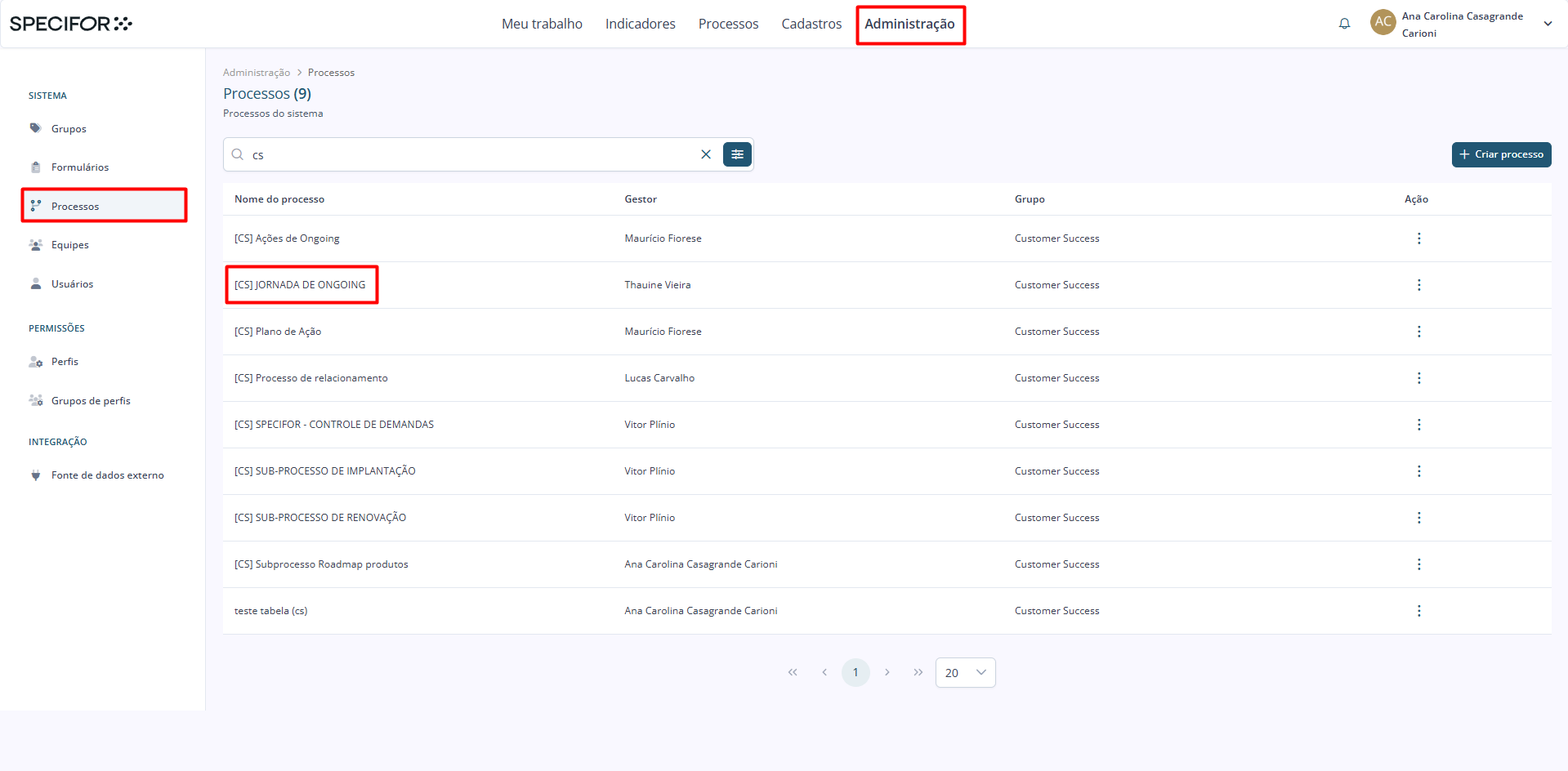 1. Após criar os dois processos que serão associados (incluindo a configuração completa dos fluxos), acesse Administração > Processos e localize o processo que será o processo pai.