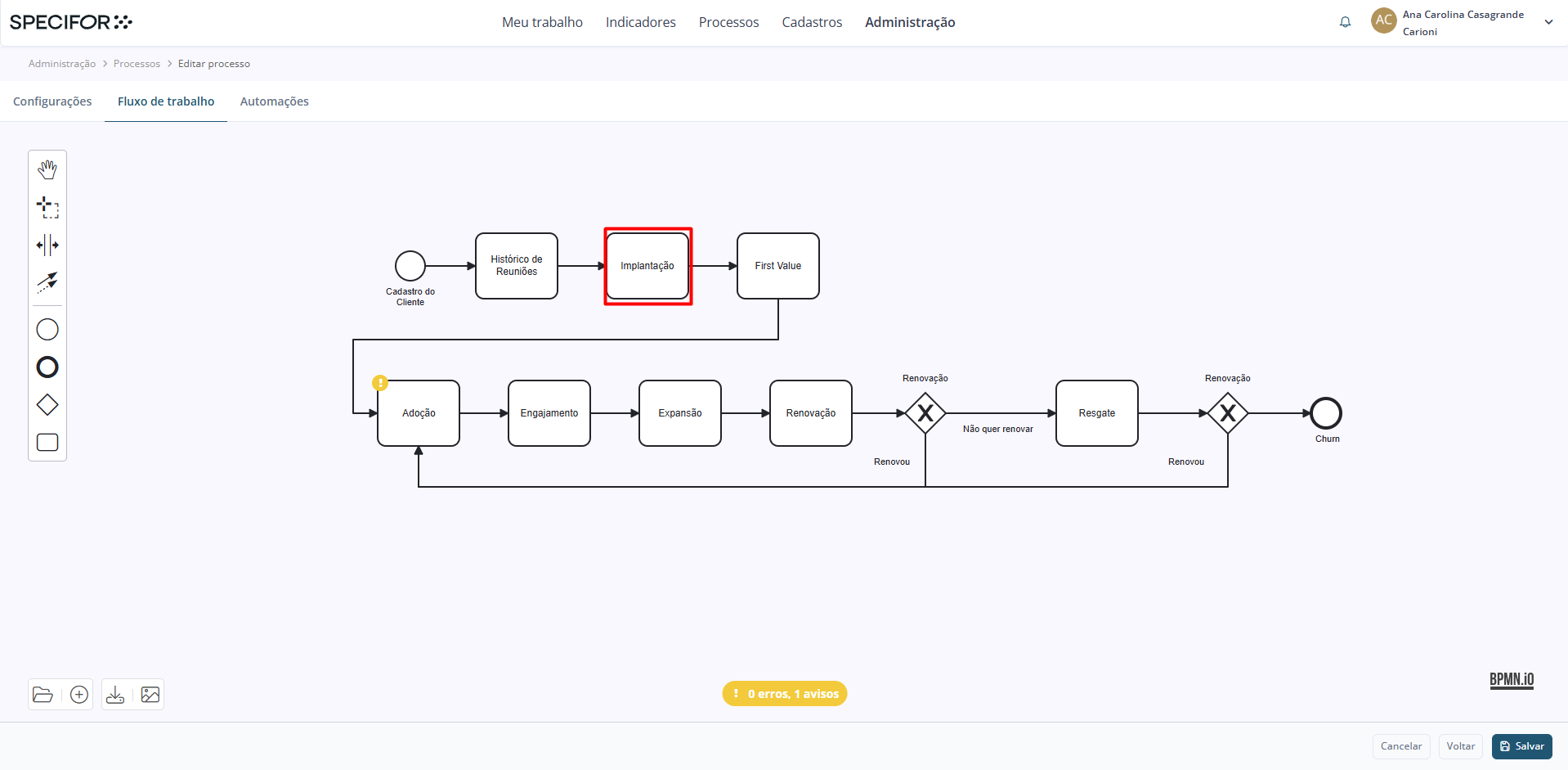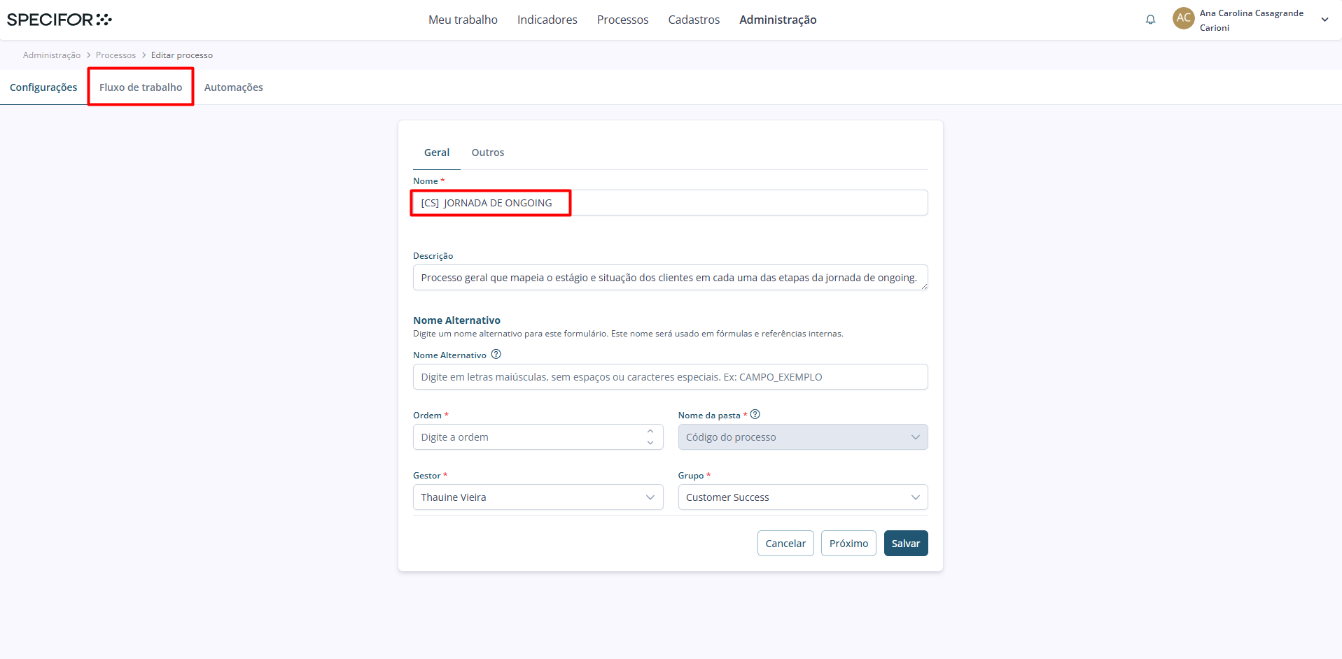 3. Acesse a aba “Fluxo de trabalho” para visualizar o fluxo do processo.
