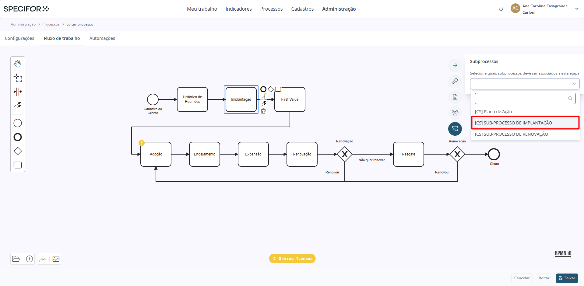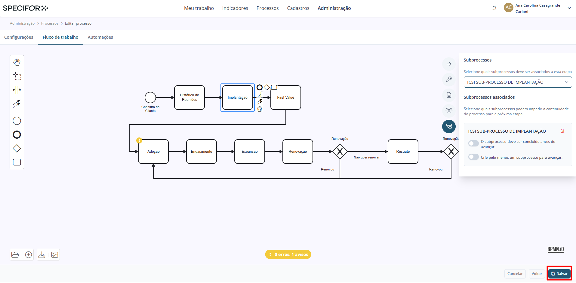 6. Selecione o processo que será vinculado como subprocesso e, em seguida, clique em “Salvar” no canto inferior direito da tela.