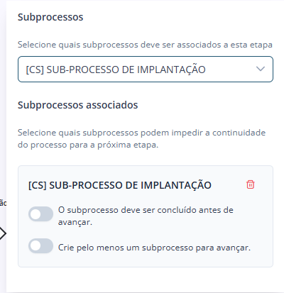 Após essa configuração, o subprocesso ficará vinculado à etapa escolhida pelo processo pai.